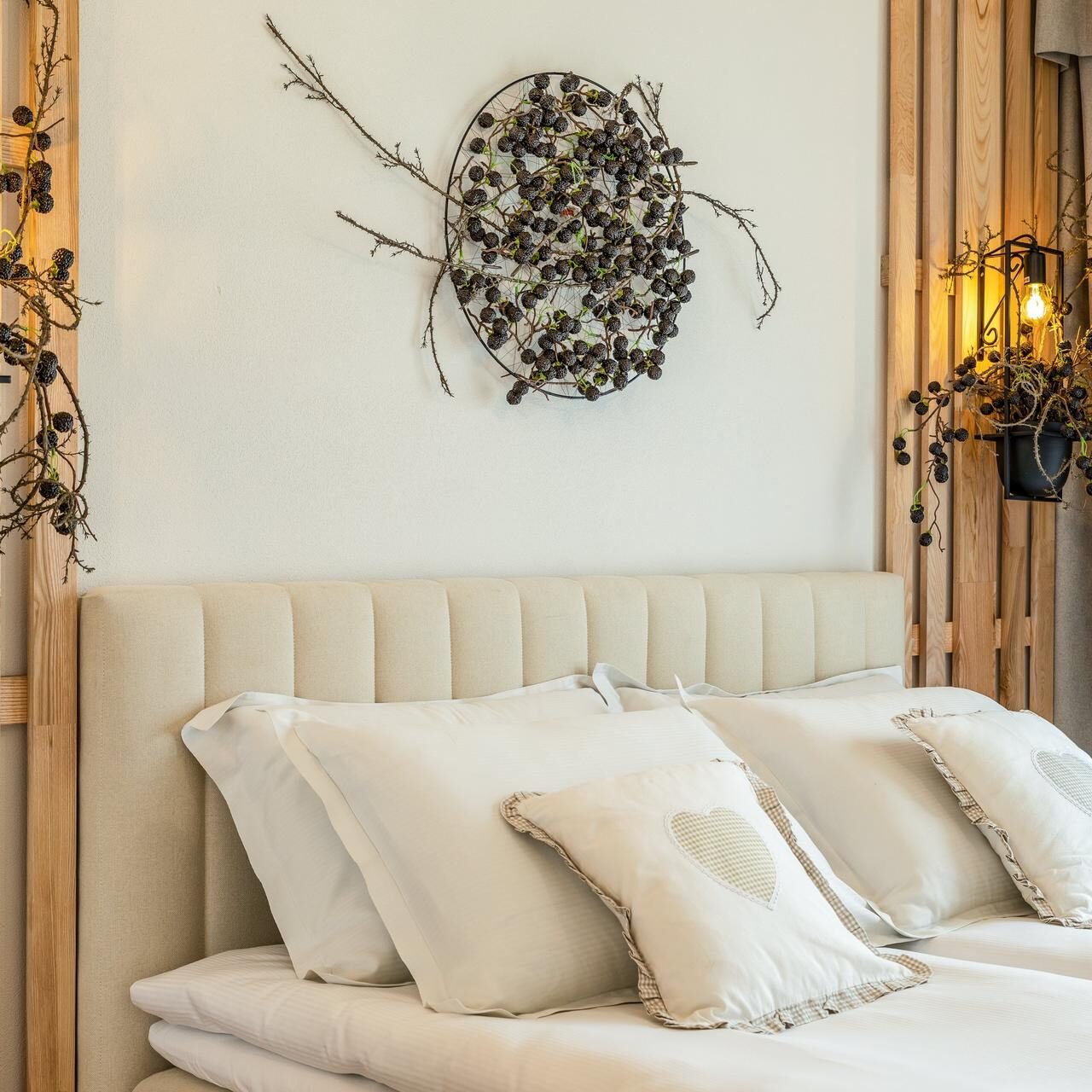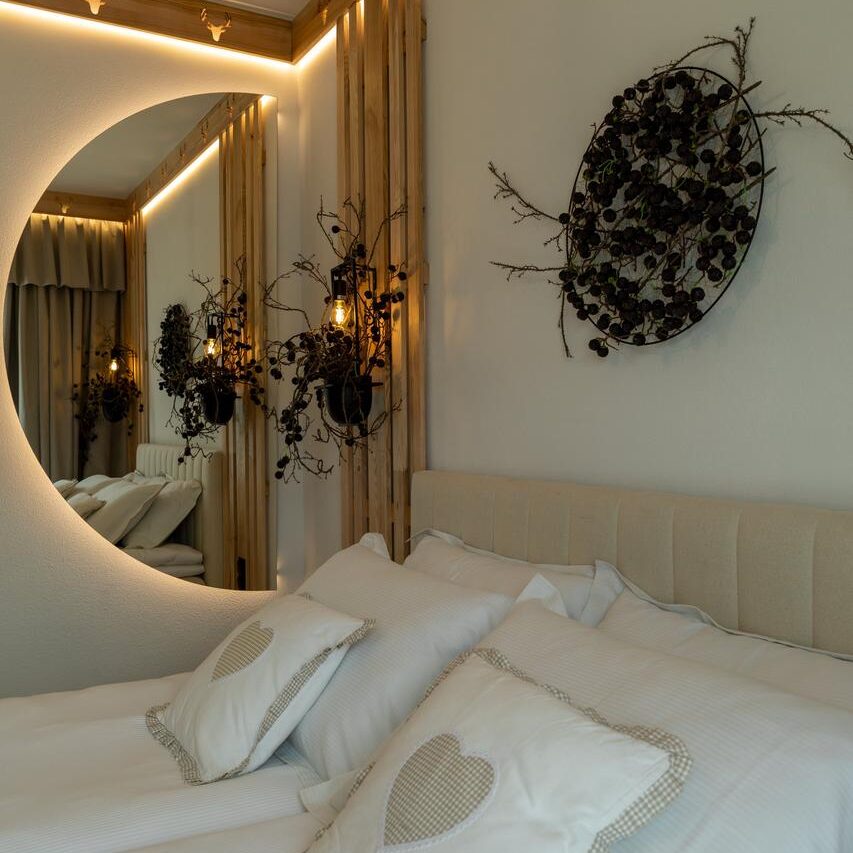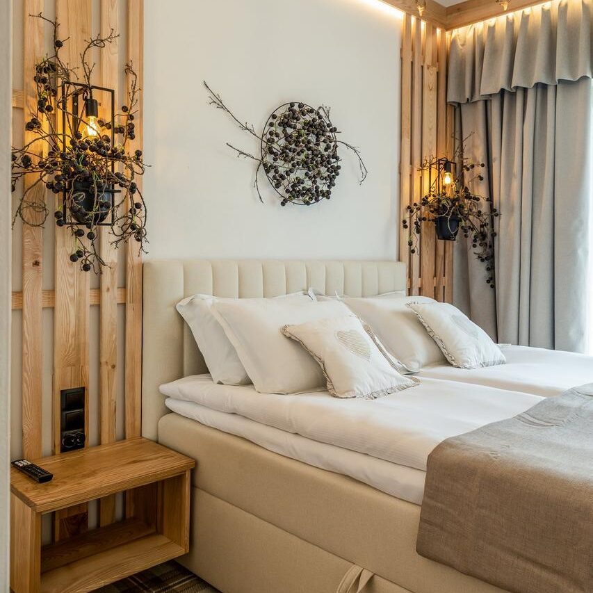 Wygodne łóżko podwójne zaprasza do relaksu i regeneracji, a przestronne wnętrze zostało zaprojektowane z myślą o maksymalnym komforcie i funkcjonalności. Każdy element dekoracji został starannie dobrany, aby stworzyć kojące i harmonijne środowisko, które sprzyja odpoczynkowi i odprężeniu. W pokojach dominuje ciepła paleta barw, która w połączeniu z naturalnymi materiałami tworzy wrażenie bliskości z naturą.