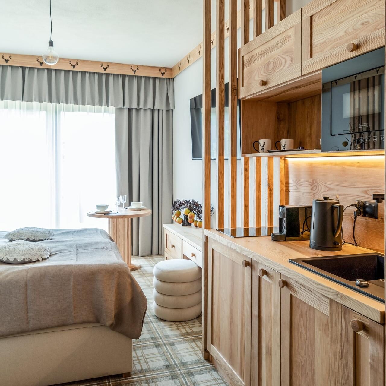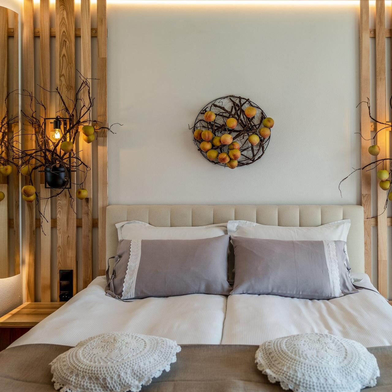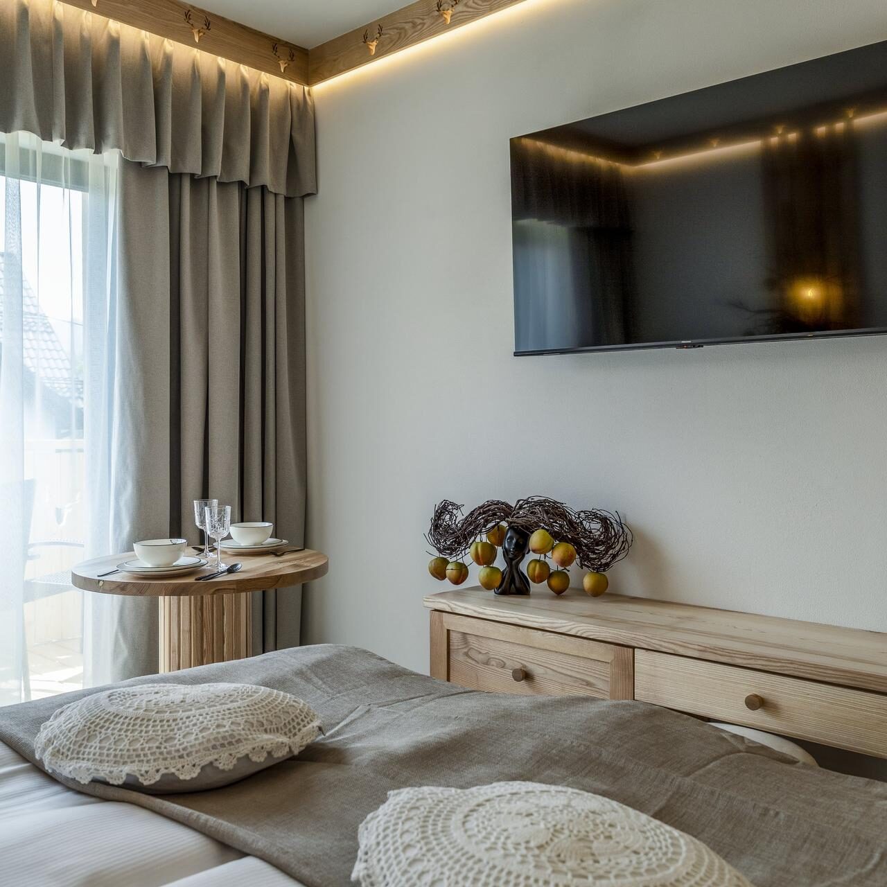 Wygodne łóżko podwójne zaprasza do spędzenia leniwych poranków, a przytulne wnętrze stanowi idealne tło dla chwil spędzonych we dwoje. Oferujemy nie tylko miejsce do spania, ale przestrzeń, gdzie każdy szczegół sprzyja wyciszeniu i odnowie. Ciesz się ukojeniem, które przynoszą barwy i motywy inspirowane naturą, i doświadcz odpoczynku w miejscu, które jest zarówno funkcjonalne, jak i estetycznie urzekające.